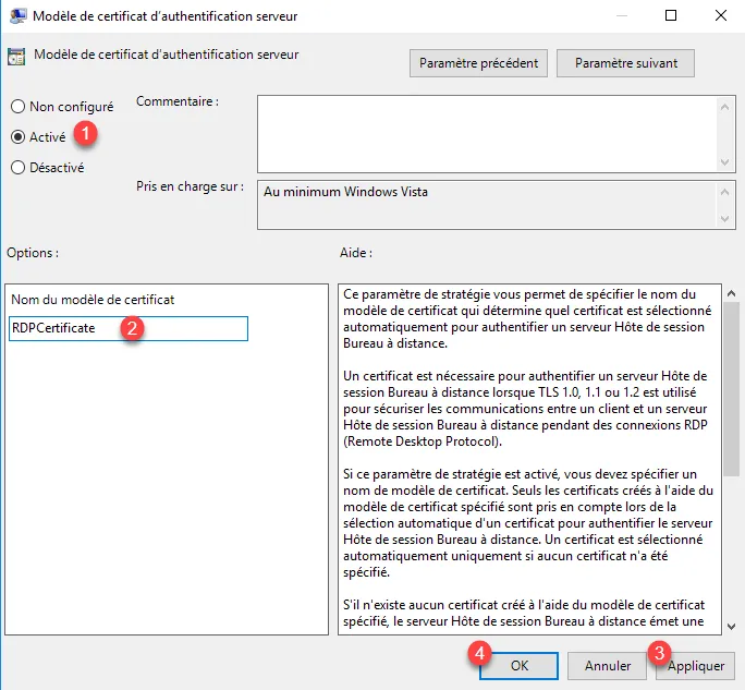 Activer le paramètres 1, entrer le nom du modèle 2 que l’on a créé en premier partie et cliquer sur Appliquer 3 et OK 4.