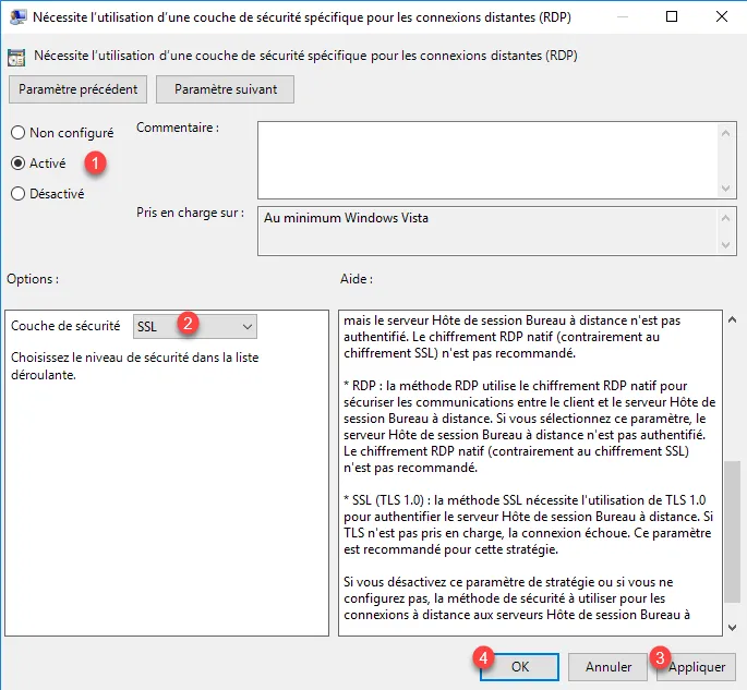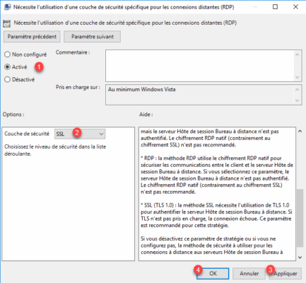 Activer le paramètre 1 puis sélectionner la couche de sécurité SSL 2 et cliquer sur Appliquer 3 et OK 4.