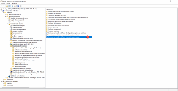 Pour finir, si vous n’avez pas encore configurer l’inscription automatique dans une autre GPO, aller à l’emplacement suivant : Configuration ordinateurs / Stratégies / Paramètres de sécurité / Stratégies de clé publique et ouvrir le paramètre : Client des services de certificats – Inscription automatique 1.