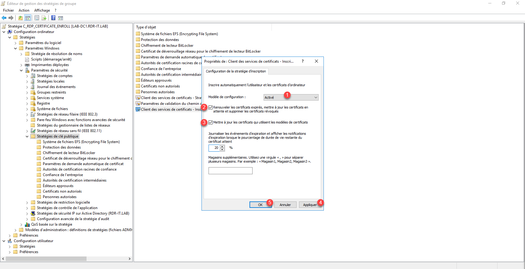 Sélectionner Activé 1, cocher les cases : Renouveler les certificats expirés, mettre à jour certificats en attente et supprimer les certificats révoqués 2 et Mettre à jour certificats qui utilisent les modèles de certificats 3 puis cliquer sur Appliquer 4 et OK 5.