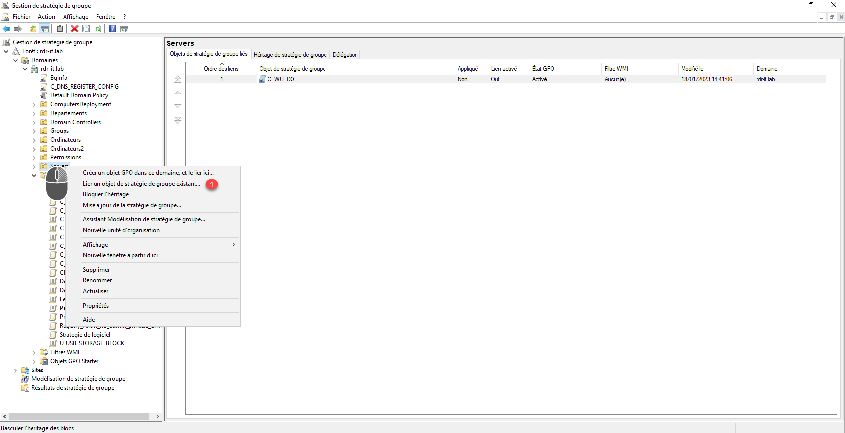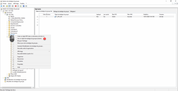 Faire un clic à l’emplacement souhaité, puis cliquer sur Lier un objet de stratégie de groupe existant 1.