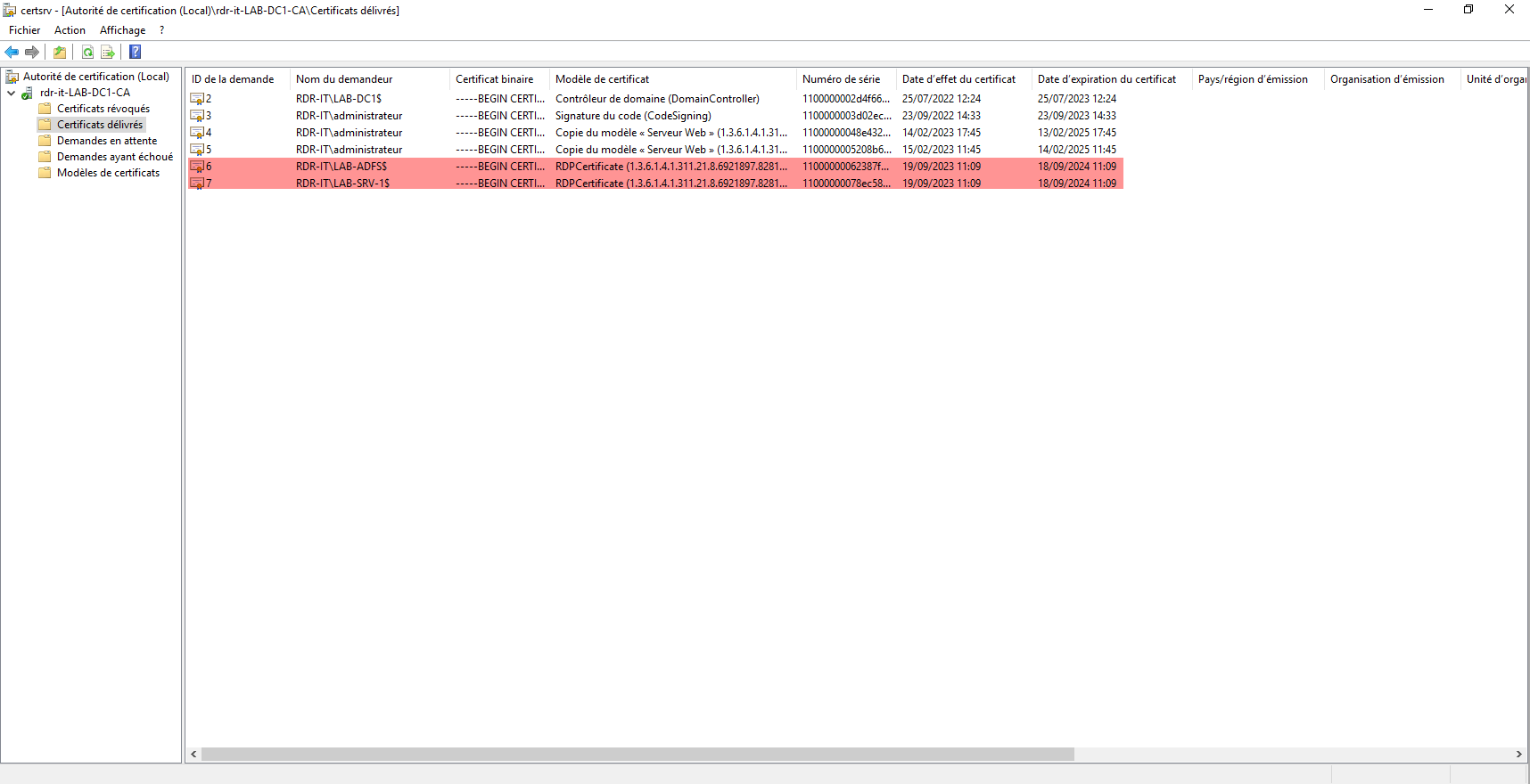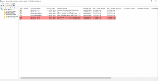 La première vérification à faire est au niveau de l’autorité de certification, regarder dans les Certificats délivrés si des certificats ont été émis.