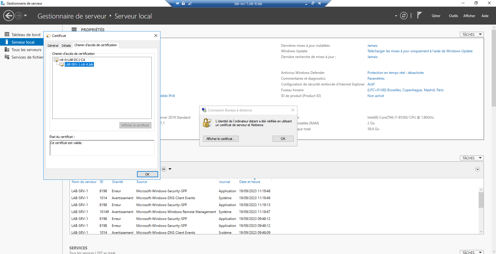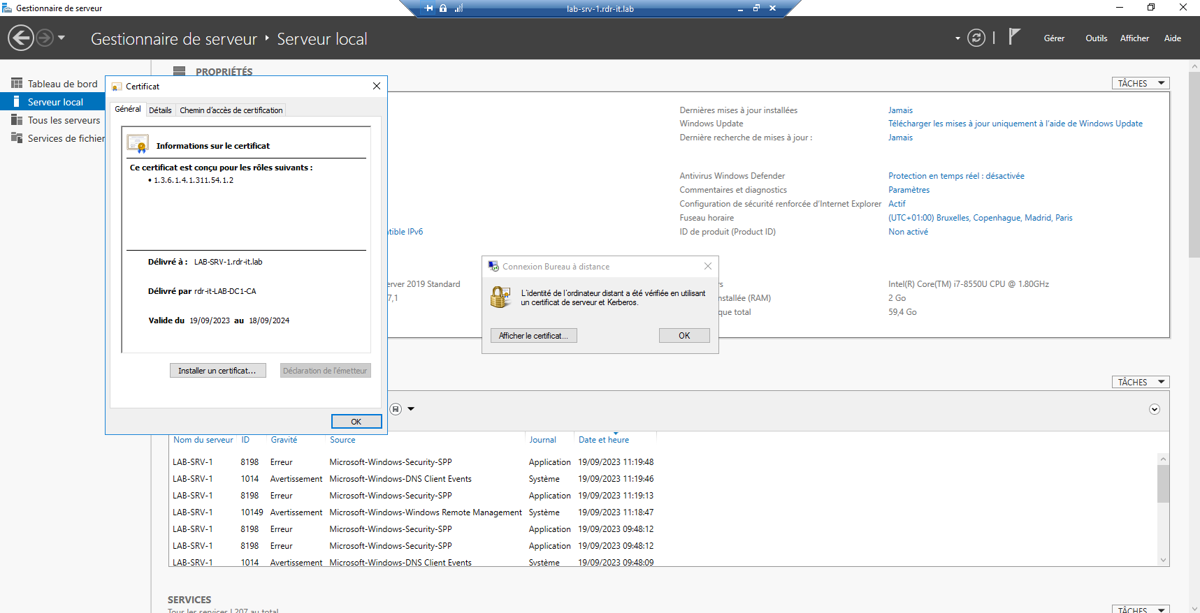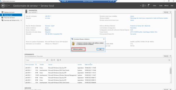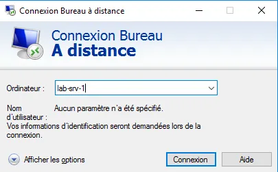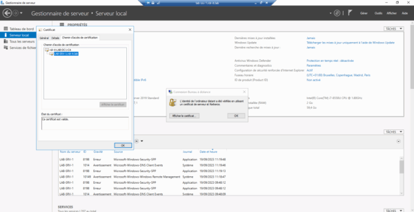 Pour valider que le certificat est bien utilisé, ouvrir une connexion RDP sur un ordinateur qui a eu un certificat de délivré, ici je vais me connecter au serveur lab-srv-1.